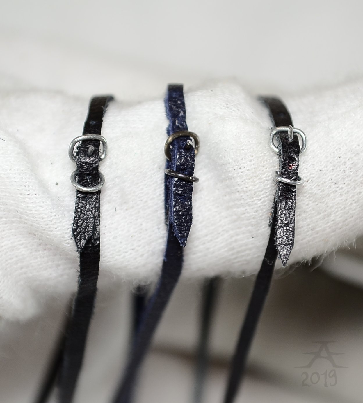 Thin, narrow reins made from fragile leather lace. On the right are reins that haven't been thinned; the lighter the underside is, the thinner it is. 2018. |